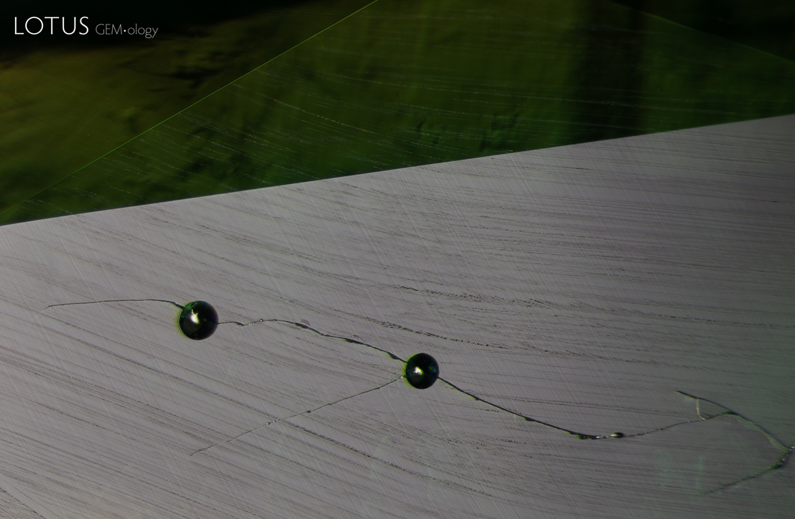 A. When this emerald was gently warmed with a hot point, droplets of resin began to leak out of the fissures. The droplets can be best observed with reflected light.