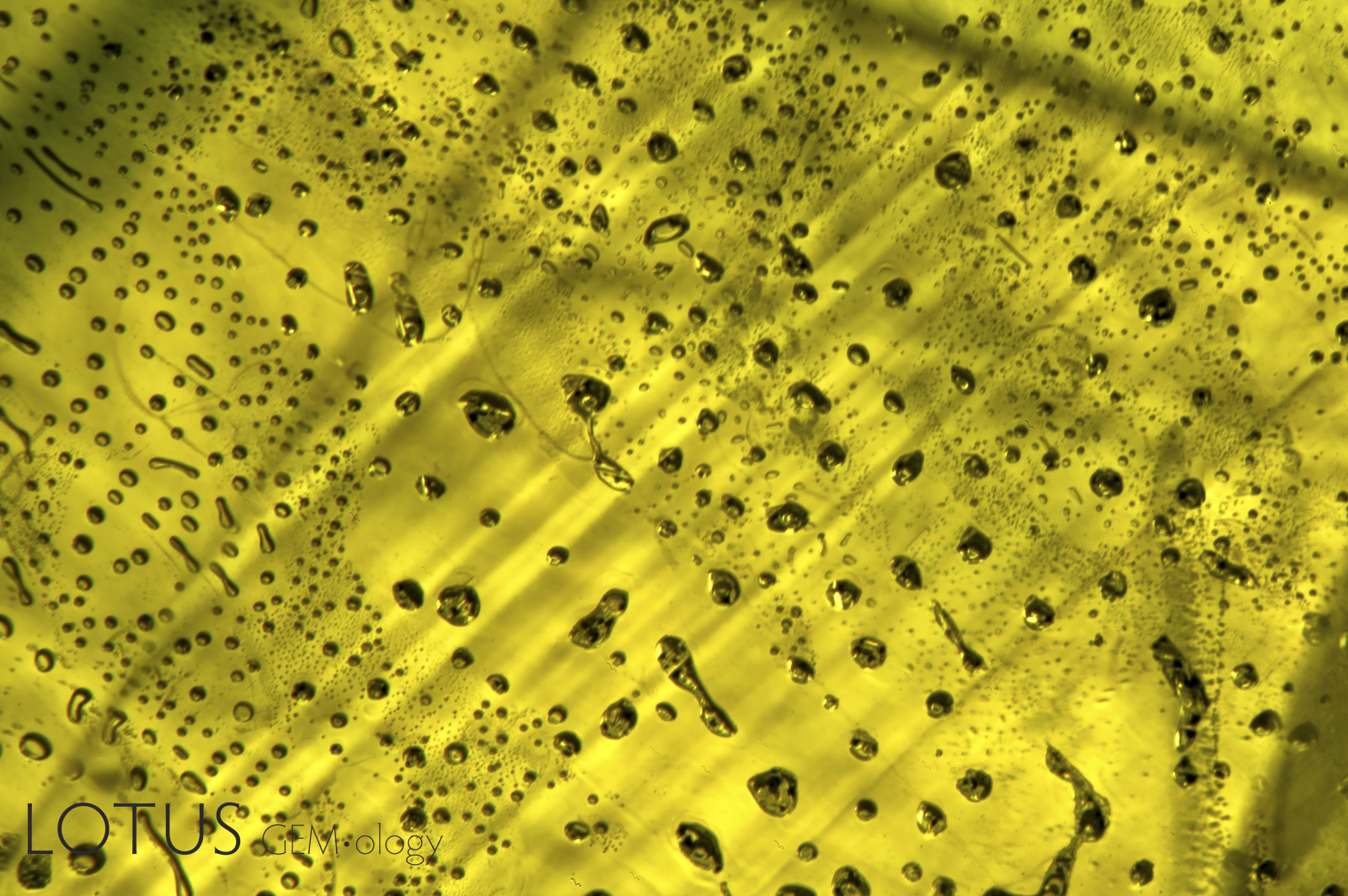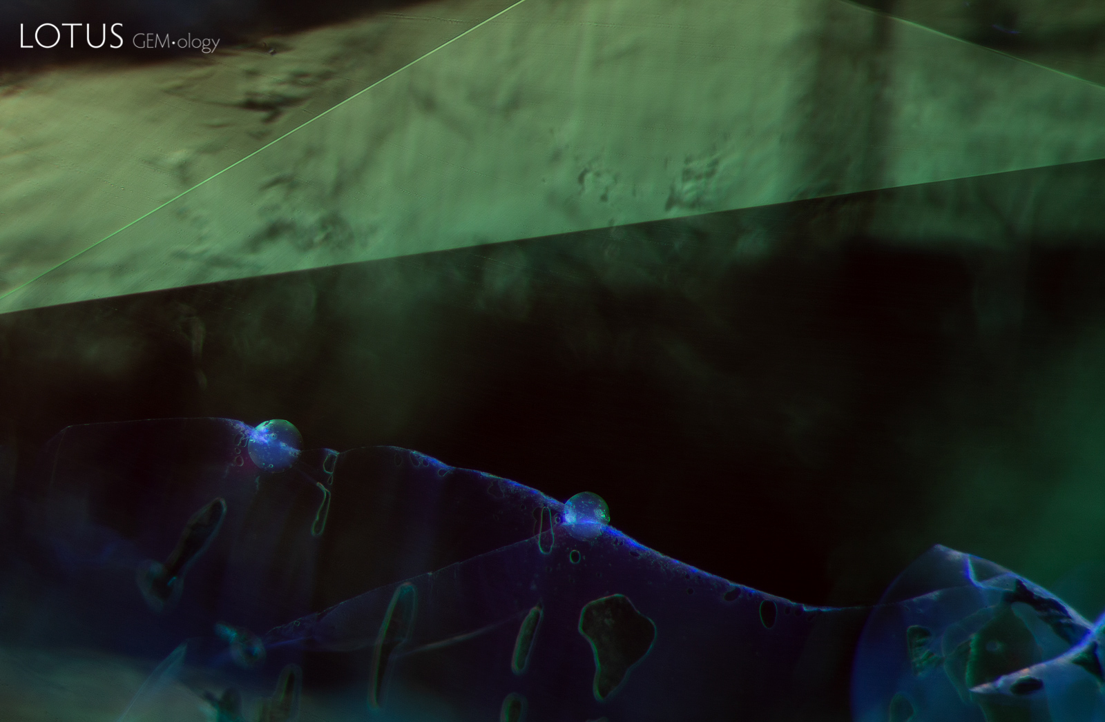 A. In this beryllium-diffused green sapphire, the high-temperature heating has healed a former fissure and the pockets of residue show clear rounding and necking down. Some also show shrinkage bubbles as the glassy material cooled and thus occupied less space, creating the bubble in the cavity. Angular growth zoning can be seen in the background.