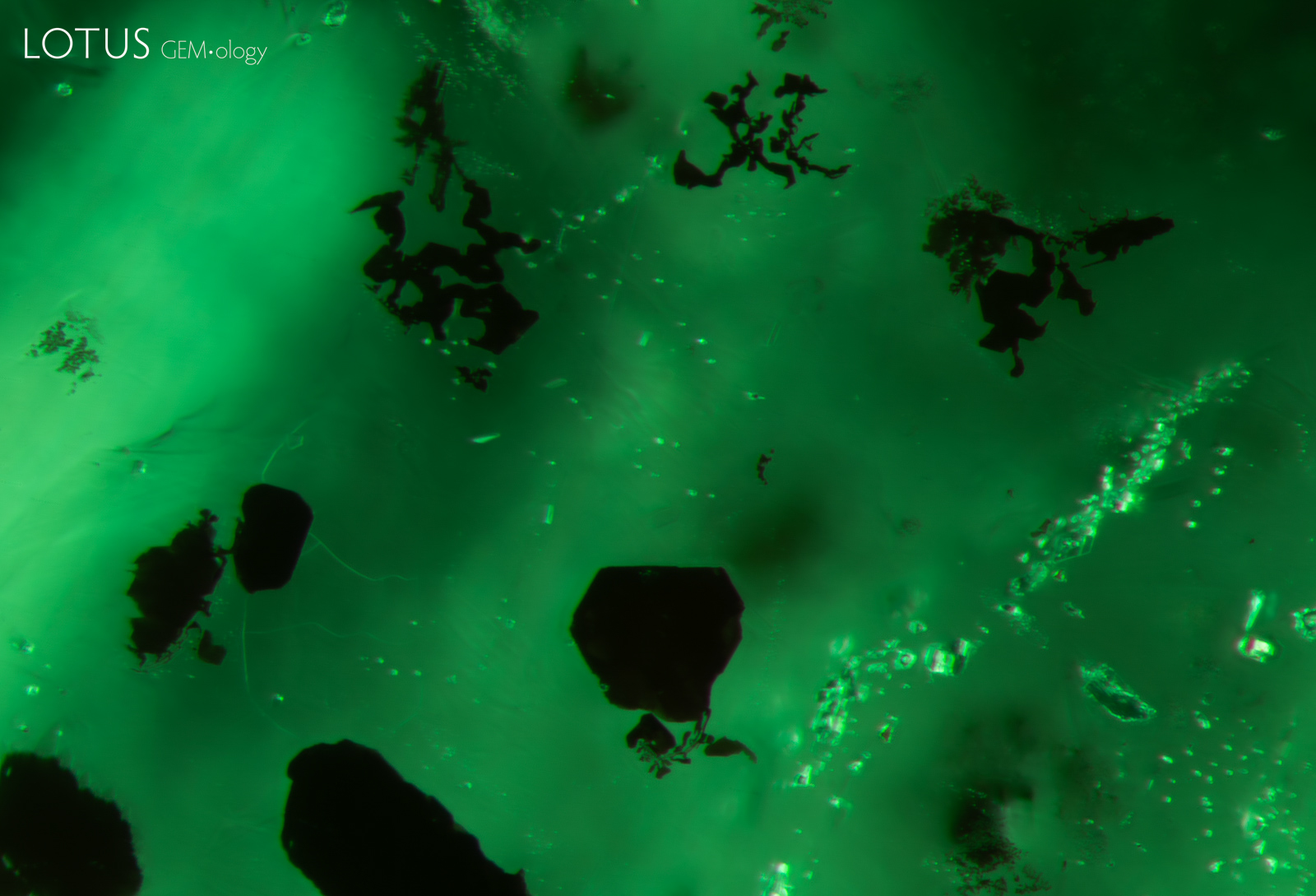 A. Dark platelets (probably ilmenite) in an emerald from Zambia, as viewed in dark field illumination. Specimen courtesy Gemfields.