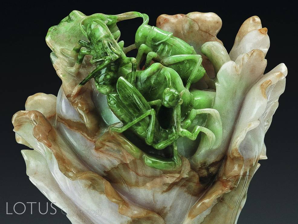 Figure 13. Detail of the Tianjin “Fei cui Cabbage with Katydids," highlighting two large-bellied katydids and a praying mantis. Photo: Tianjin Museum.