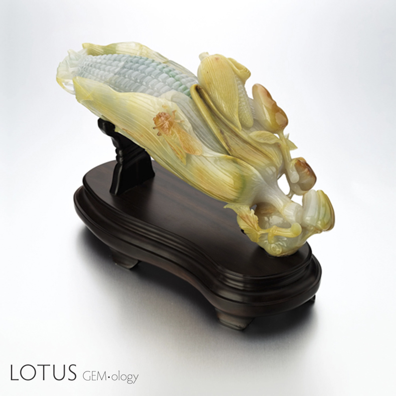 This broad consistency between written accounts and surviving objects should incline us further to believe that the former (memoirs and unofficial histories) possess at least some degree of reliability. Although no fei cui watermelon object has appeared to date, given fei cui’s multicolor property, carving a fei cui watermelon is entirely plausible. For example, the modern fei cui work “Natural fei cui with Natural Yellow fei cui ‘Abundant Harvest’” uses natural colors巧色 (color zoning) to carve corn kernels in white and green (Figure 14).[48] A fei cui watermelon would likely be carved using a similar technique.