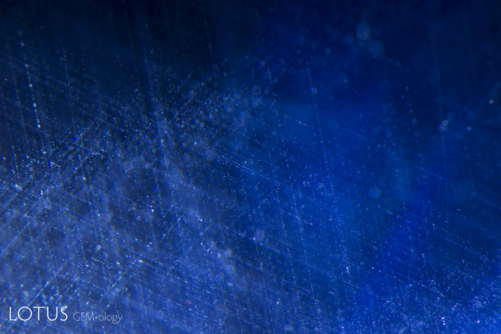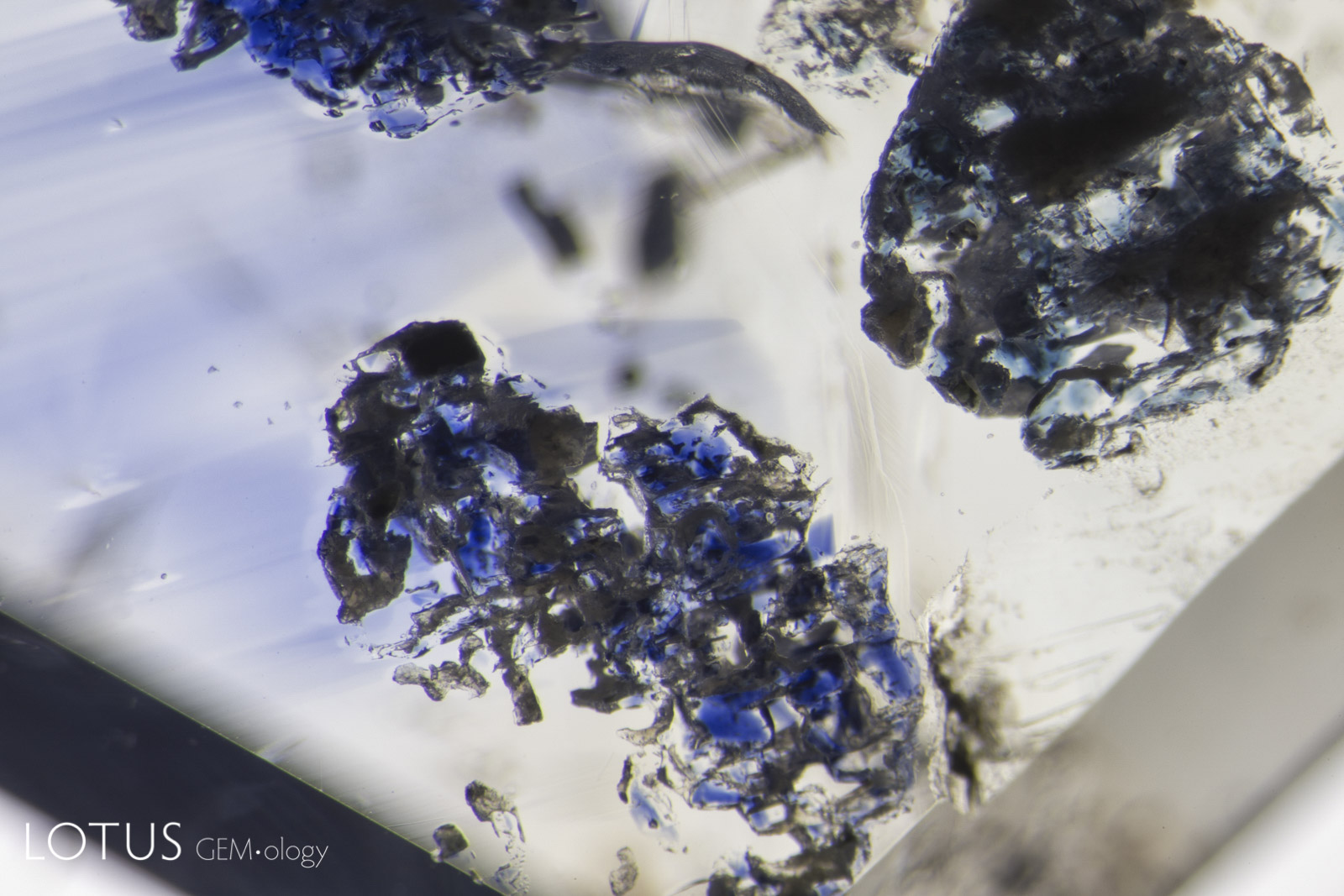 1. This image clearly illustrates what master photomicrographer John Koivula has termed “chromophore cannibalization.” As titanium is drawn out of solid solution to form exsolved rutile silk, the area in the immediate vicinity is decolorized, losing its blue color. This is a natural process and is the reverse of “internal diffusion,” where heat treatment sends the titanium back into solution, creating blue clouds or “inkspots” around the rutile remnants.