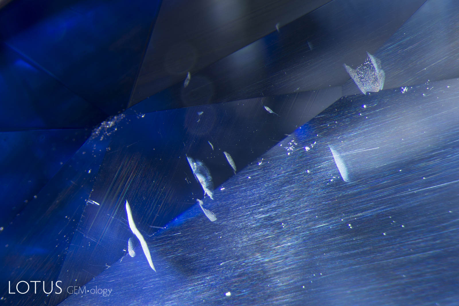 1. When a crystal is heated (either by a magma or artificially by human intervention), it expands. Tension is often relieved by a fissure in the weakest direction, which in corundum is in the basal plane. Such fissures are difficult to see in dark-field illumination.