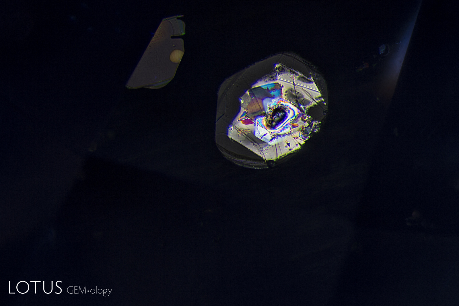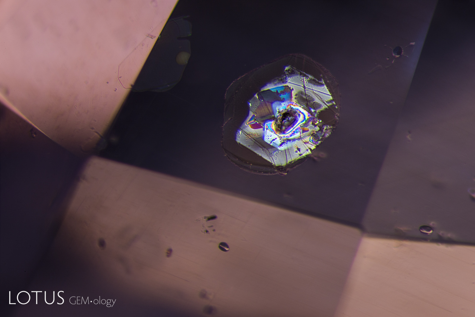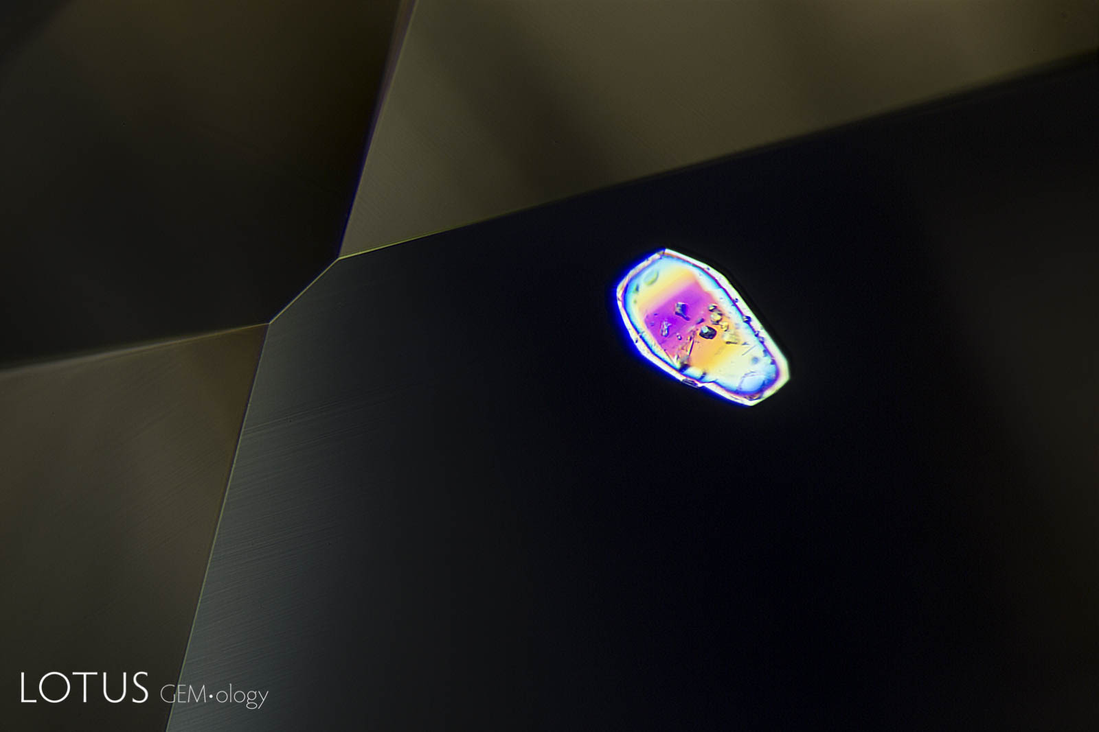2. Switching to crossed polars illuminates the sapphire inclusion dramatically.