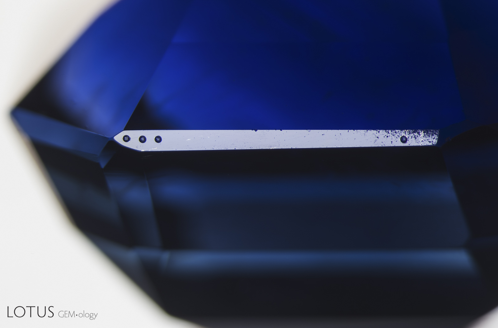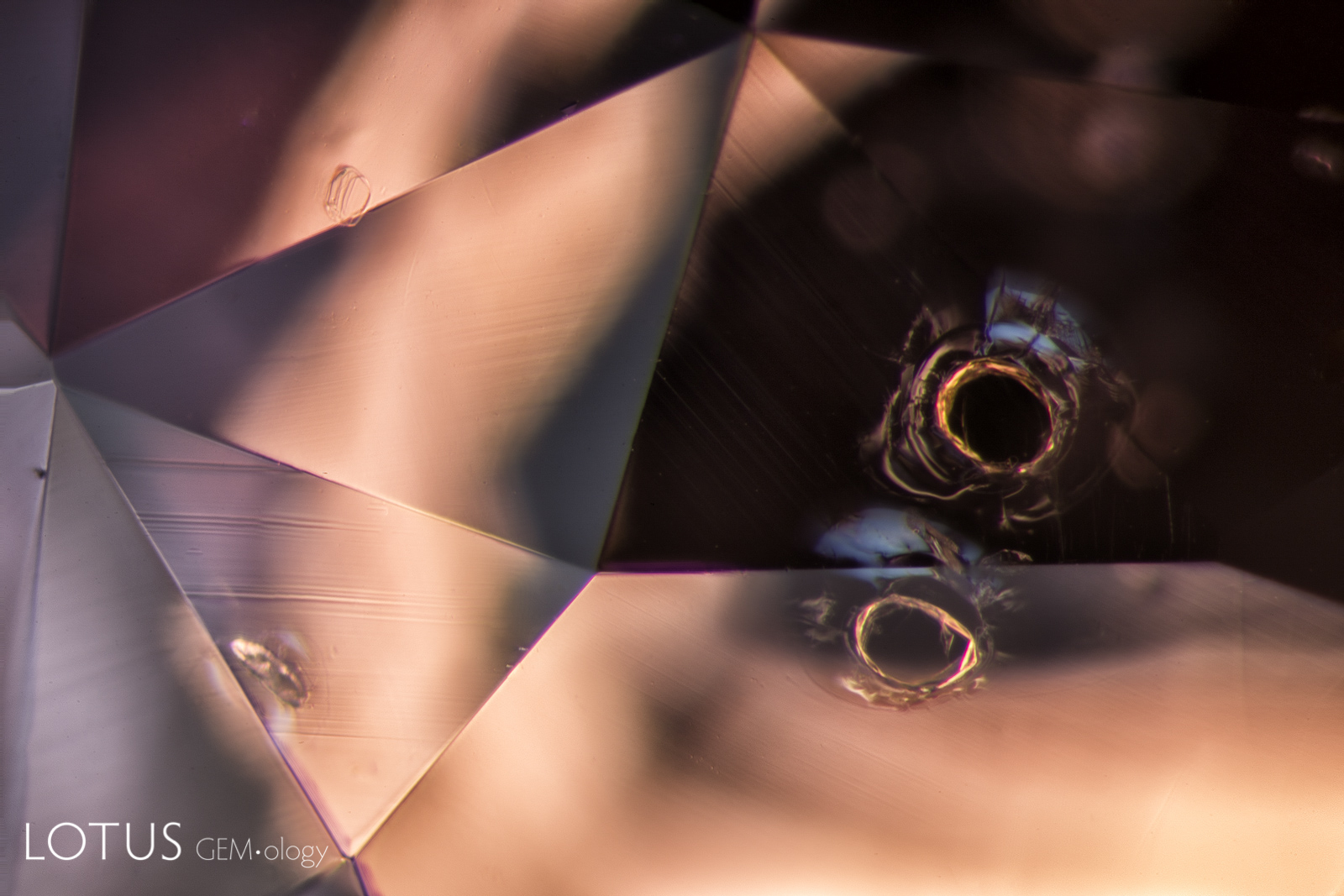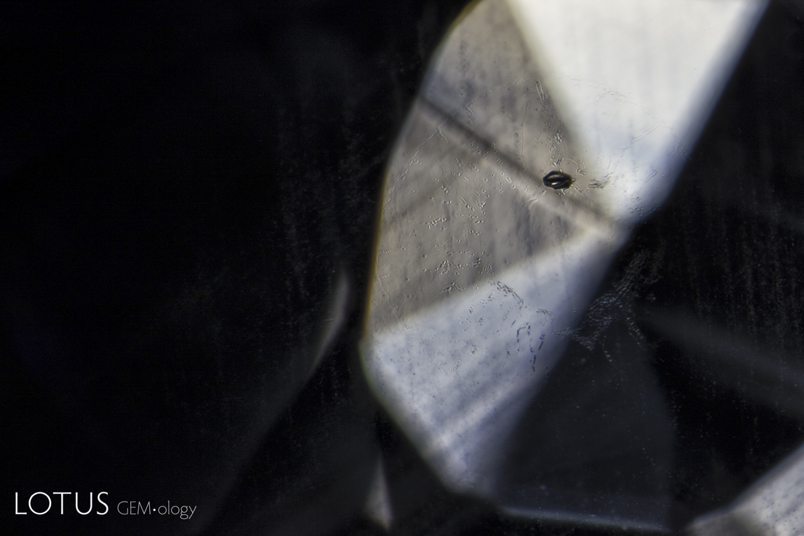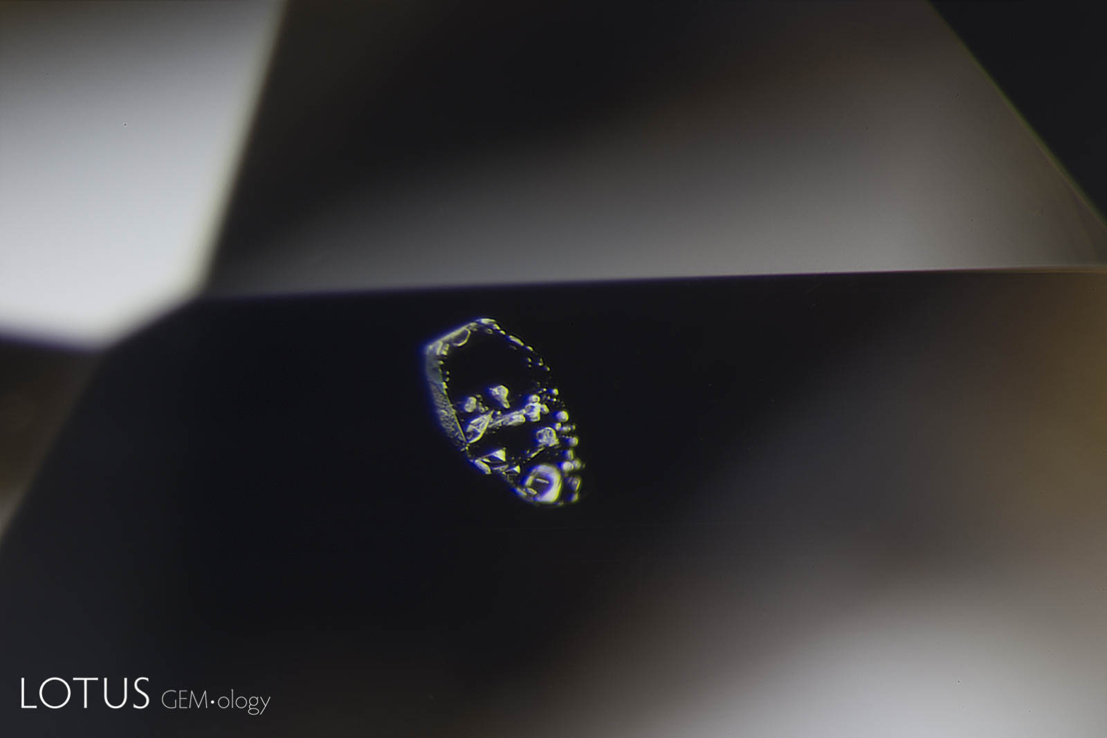 2. As the gem is rotated in the stoneholder, the bubble moves. Such fluid-filled cavities (generally filled with liquid and gaseous CO2) cannot withstand heat treatment and thus are proof of natural origin.