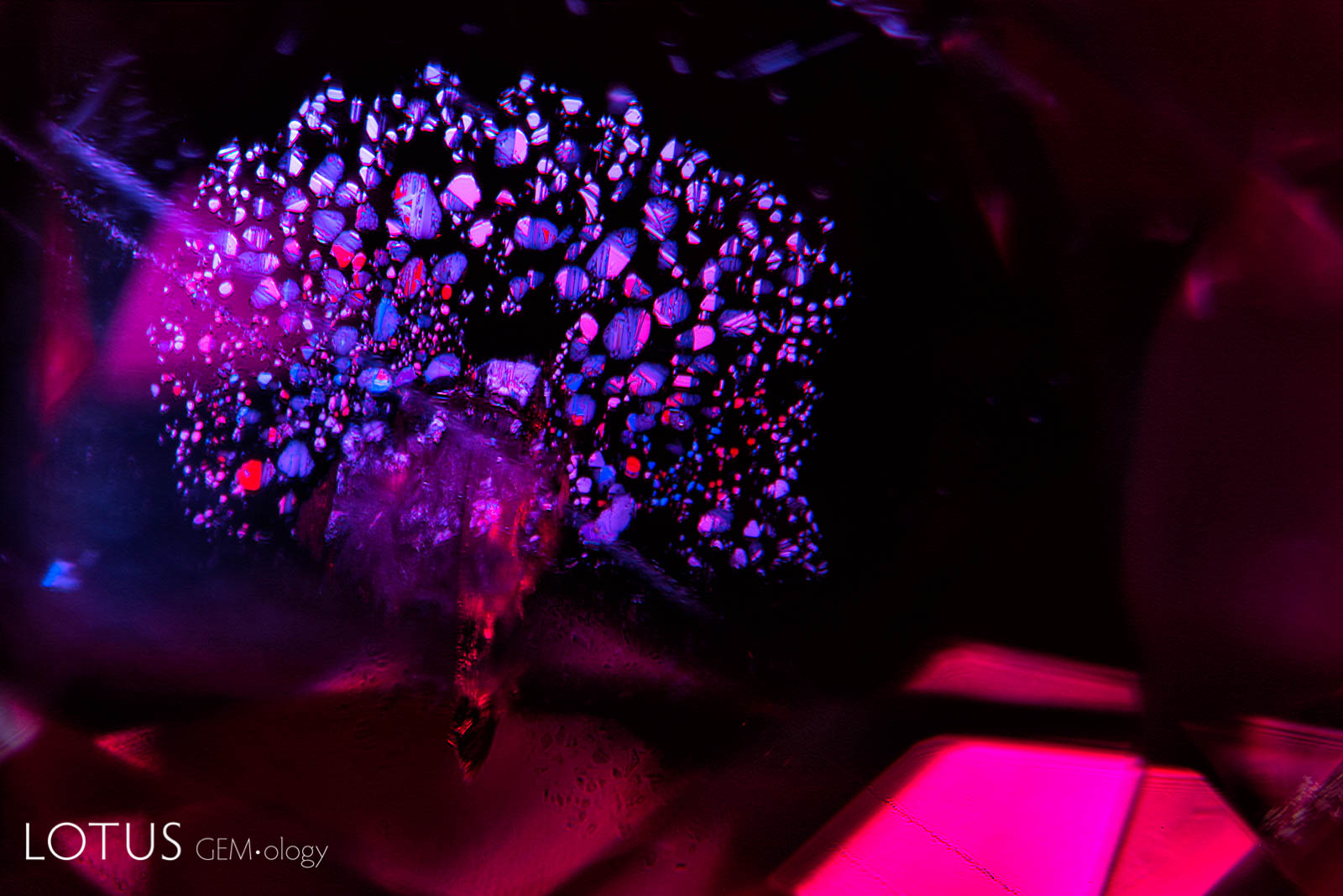 1. Rosette inclusion surrounding a mica crystal in an unheated Mozambique ruby, seen in transmitted.