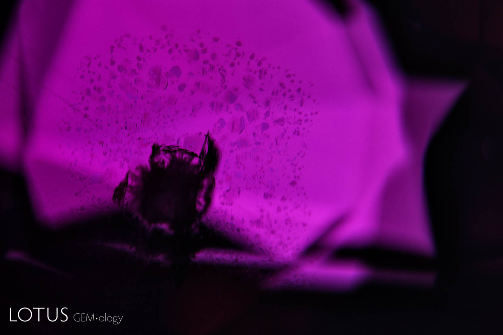 2. The same stone when viewed with diffuse light-field illumination. Here you can clearly see the color concentrations around the particles.