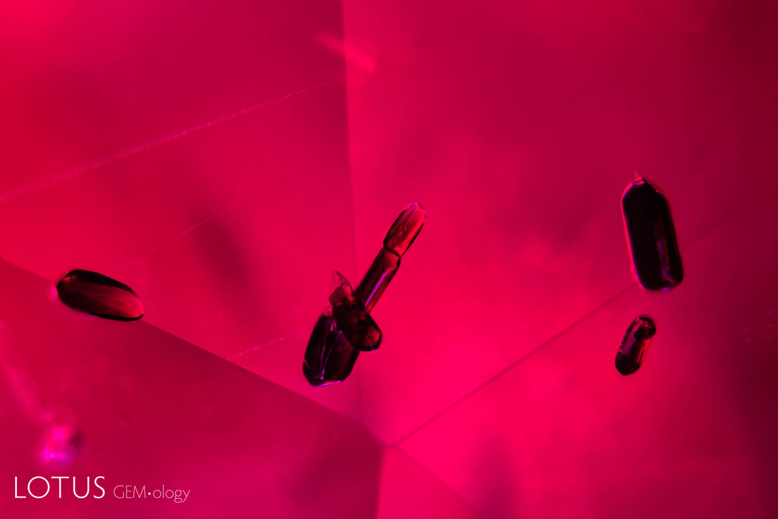 1. With oblique fiber optic illumination, primary rutile crystals in an untreated Madagascar ruby show a dark red color.