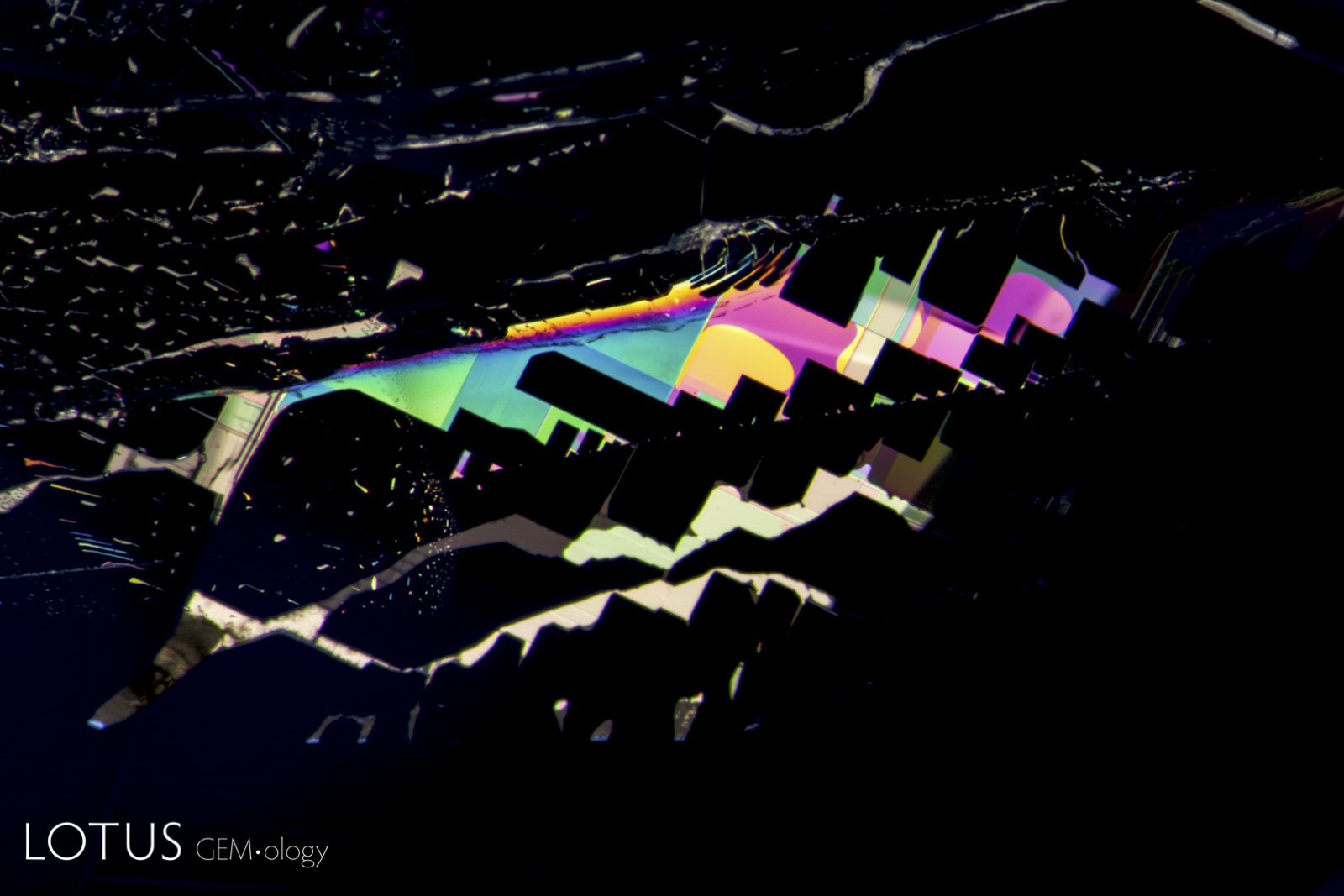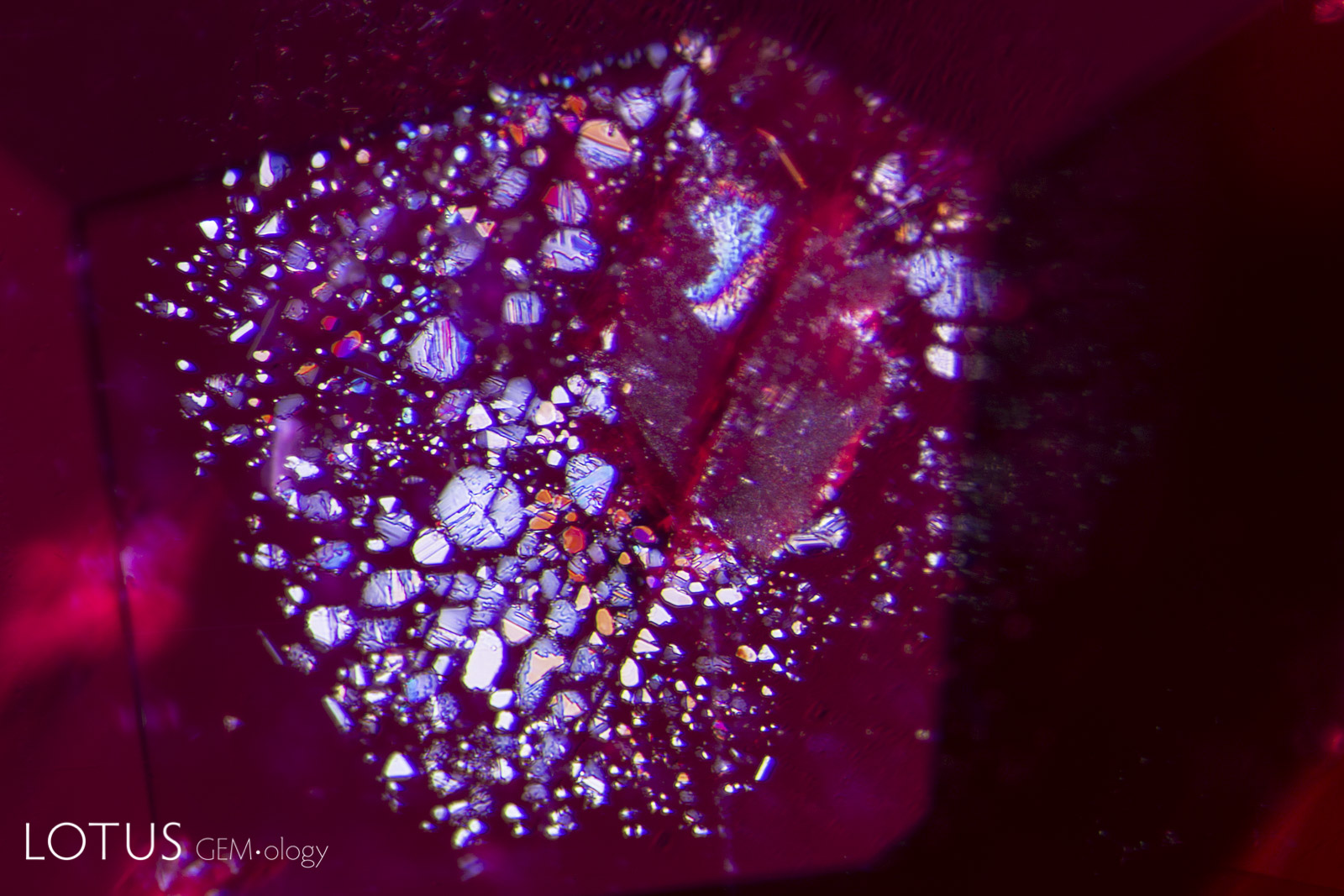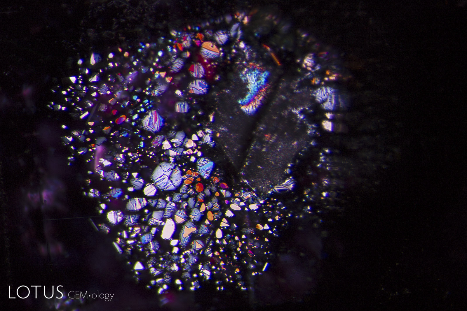 1. Unusual birefringent crystals in a low-relief partially healed fissure in a sapphire treated with high-temperature heat plus modest pressure (HT+P). When tested with Lotus Gemology’s microraman, they proved to be corundum. It is thought that they crystallized during the treatment process. FOV 4 mm.