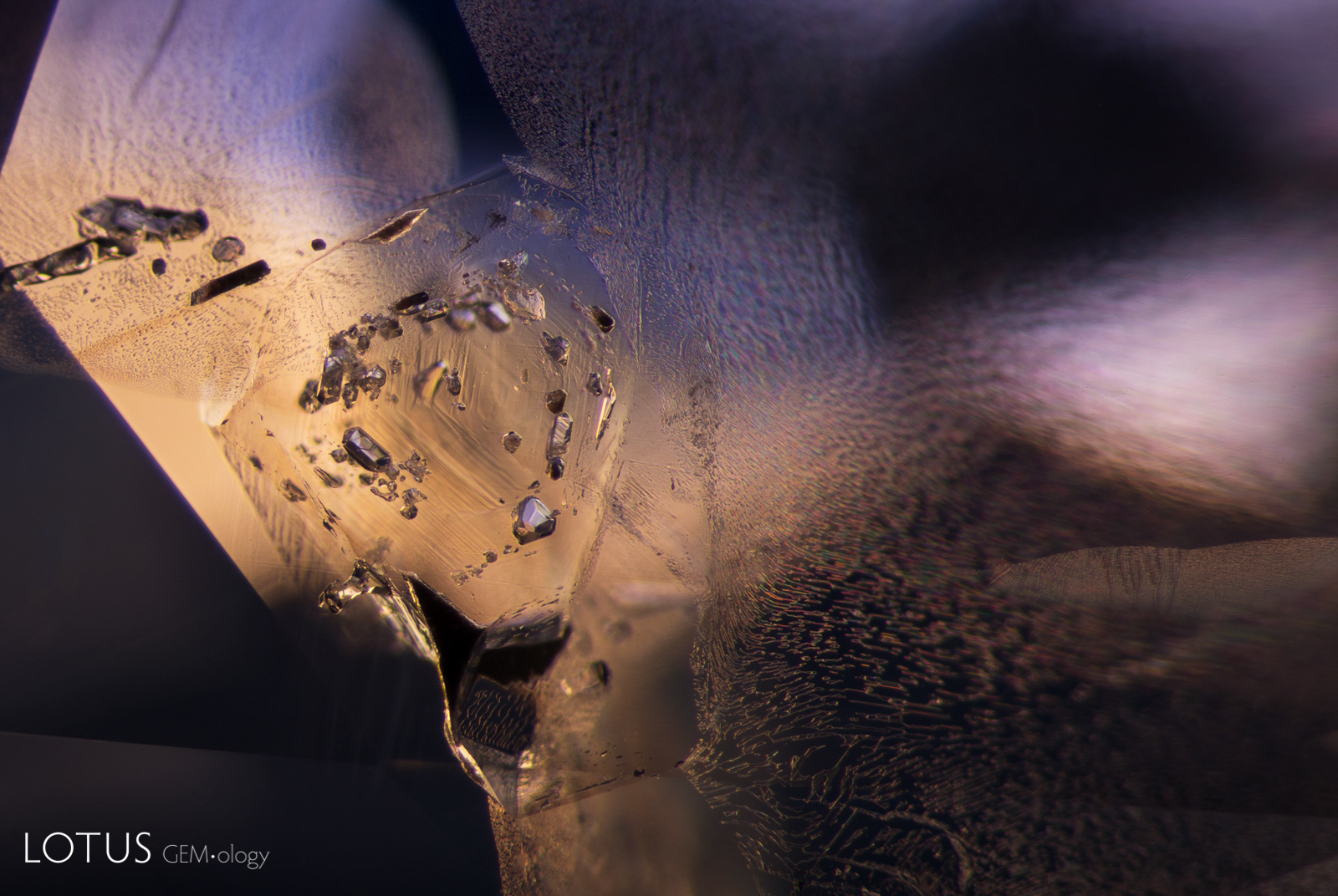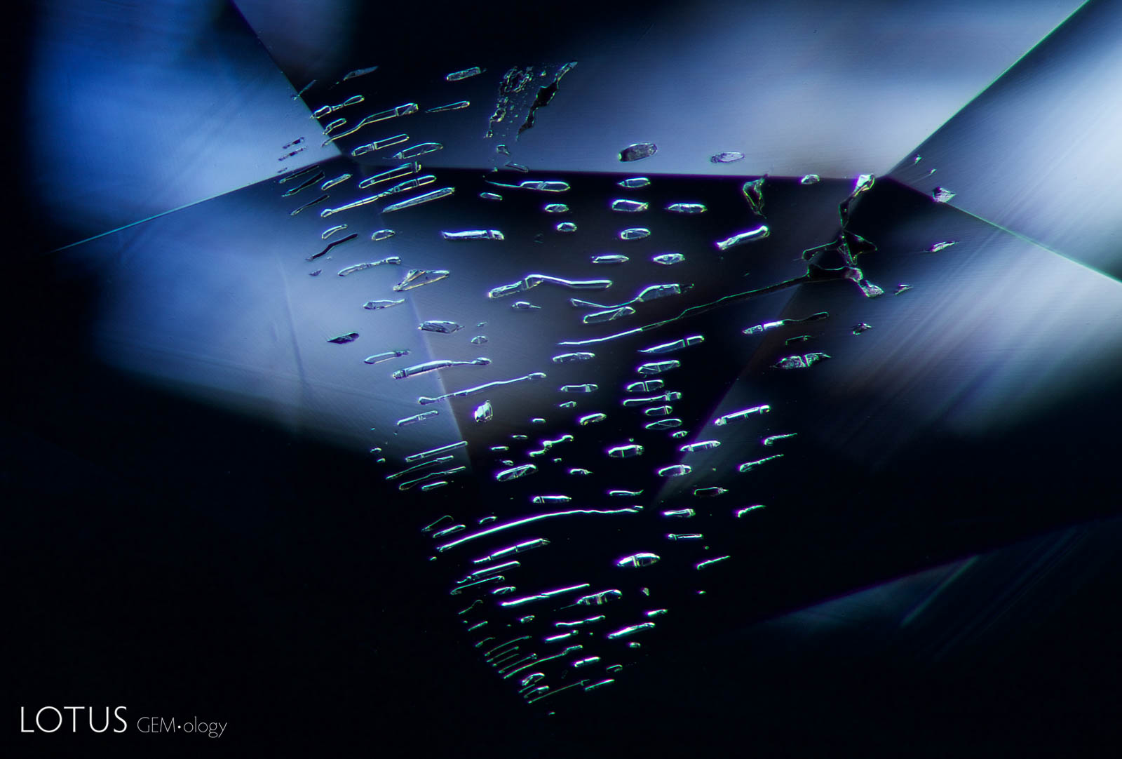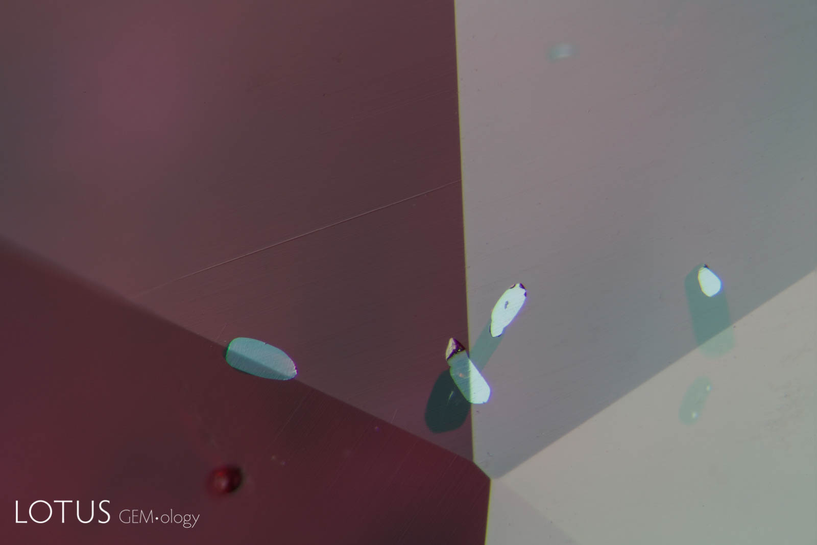 1. Unusual birefringent crystals in a low-relief partially healed fissure in a sapphire treated with high-temperature heat plus modest pressure (HT+P). When tested with Lotus Gemology’s microraman, they proved to be corundum. It is thought that they crystallized during the treatment process. FOV 4 mm.
