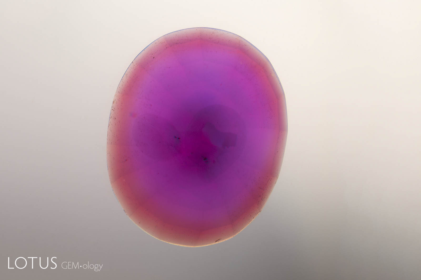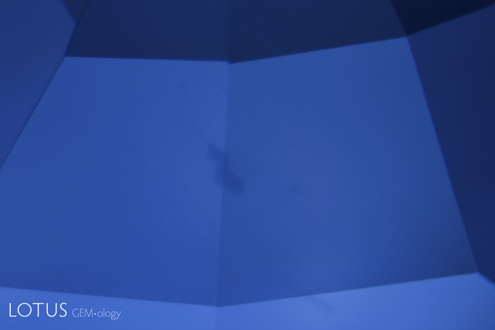1. Due to the size of the titanium ion, bulk diffusion with titanium achieves only shallow penetration (up to 0.5 mm). The result is color concentrations at the girdle and facet junctions, as shown above. Synthetic sapphire; Verneuil; Heat + Diffusion (H-D); Diffuse Light Field (Transmitted Light).