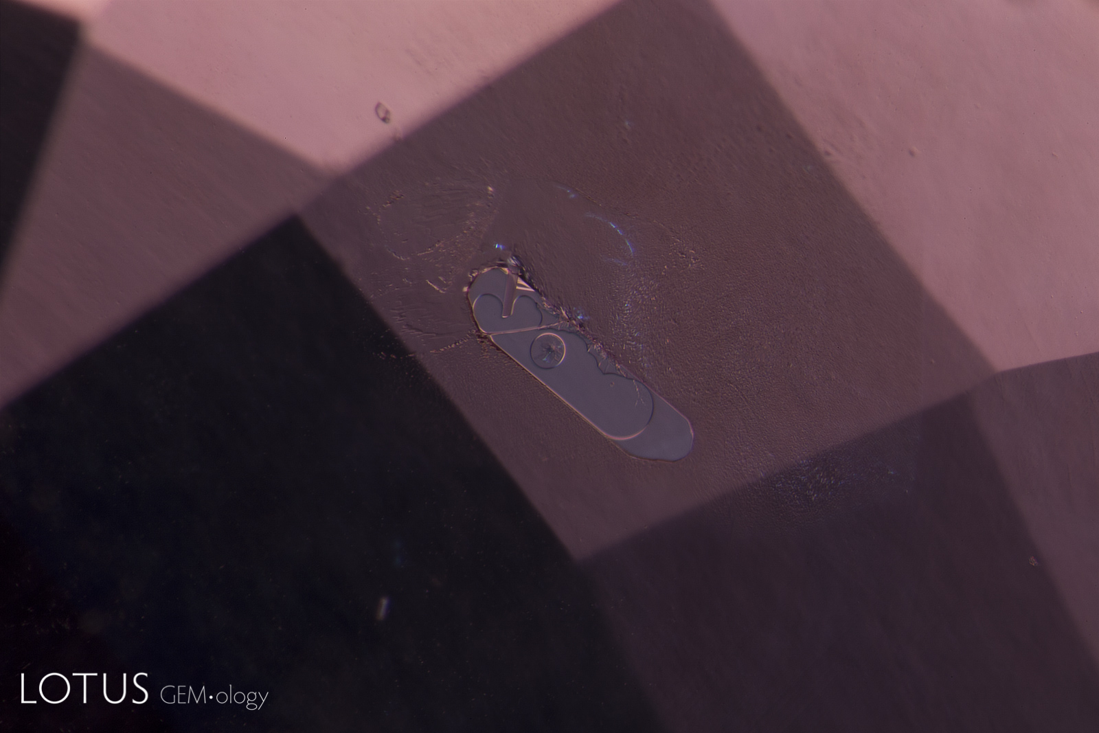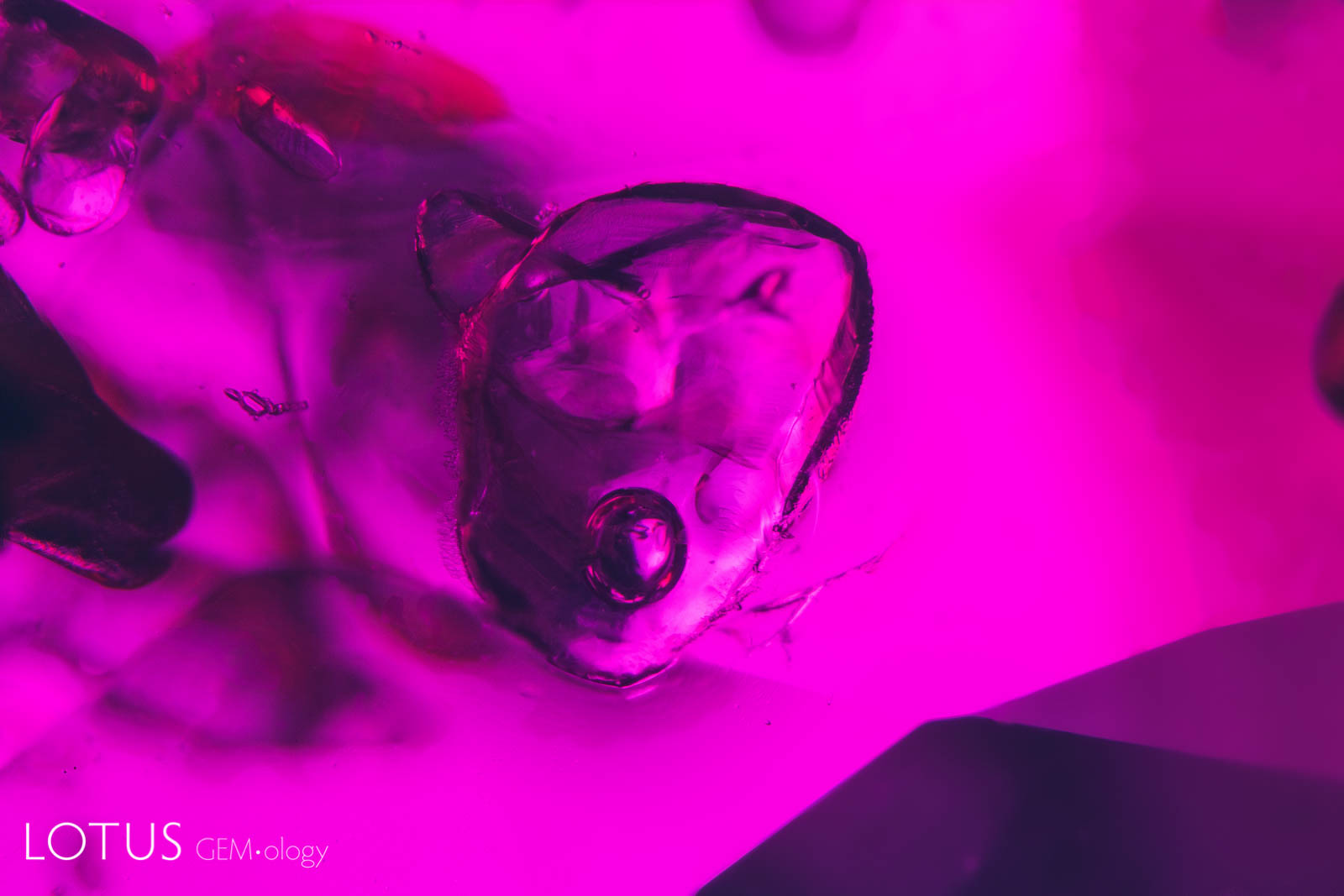 1. In this heated and fissure-healed ruby from Myanmar, a surface cavity is filled with glass. The glass can be identified by the gas bubble at the lower part of the cavity.