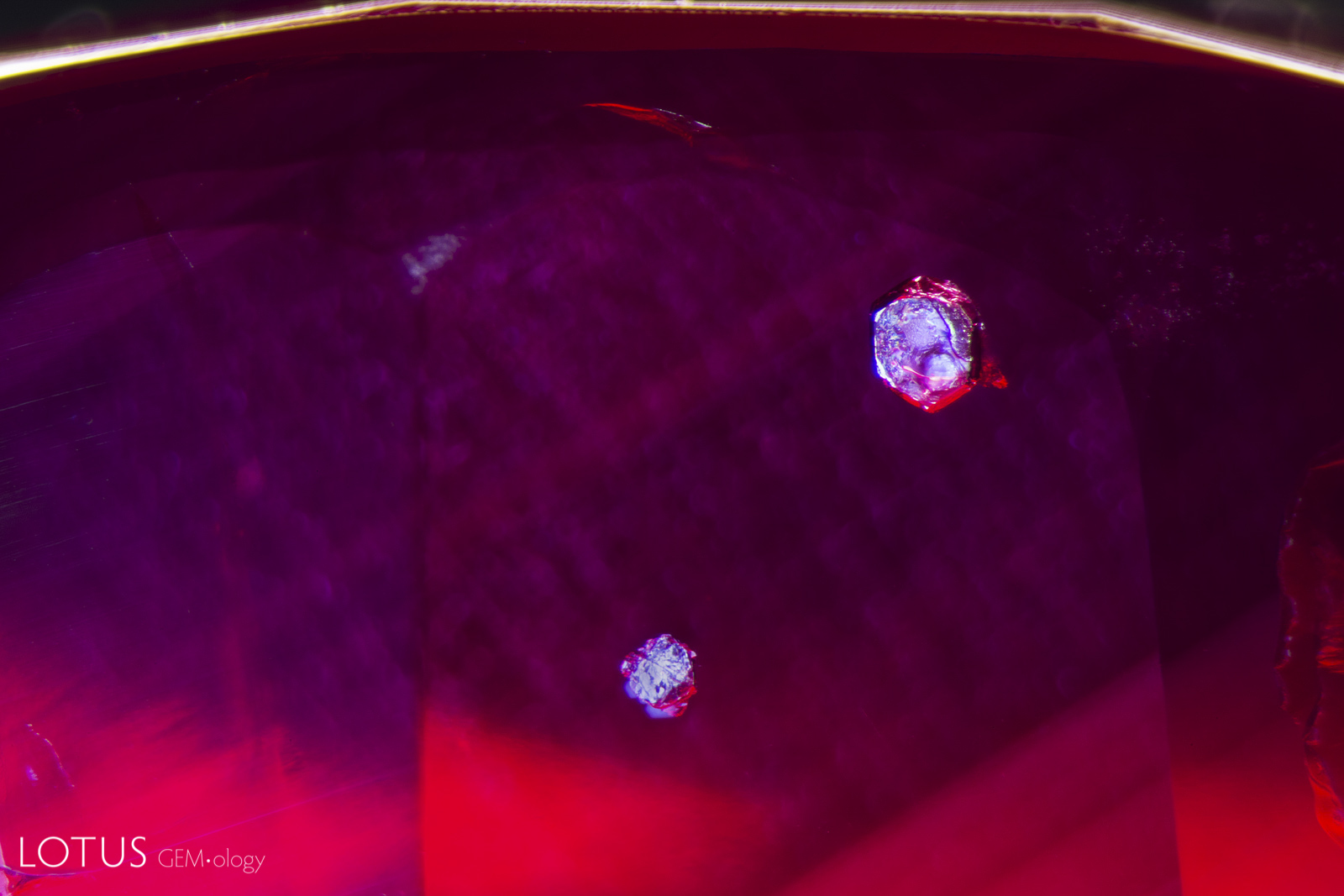 1. Overhead lighting was used to photograph this scene in a violet sapphire from Sri Lanka, which shows two large mica plates. The undamaged state of the mica reveals that this sapphire has not been subjected to heat treatment.