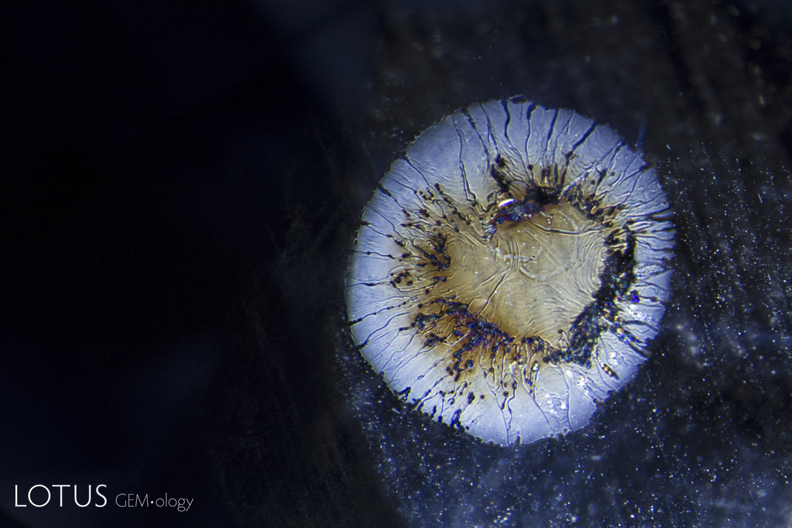 2. When a rutile-silk containing sapphire is artificially heated, titanium from the rutile dissolves into the surrounding sapphire. Once in solid solution, the titanium reacts with iron, creating a blue color. The result is tiny blue halos surrounding the remnants of the rutile silk, a process dubbed “inkspot internal diffusion” by John Koivula. This partially dissolved silk with blue color concentrations is a clear sign that the sapphire was heated and is the opposite of chromophore cannibalization.