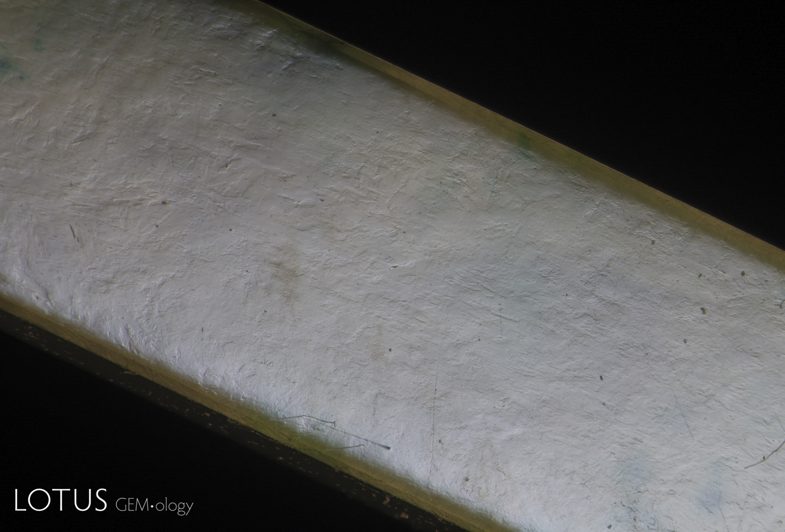 1. The first step of preparing a piece of fei cui jade for polymer impregnation is to boil it in acid to remove any mineral impurities from the tiny fissures between the individual crystal grains that make up the jade rock. These fissures are then filled with a polymer. Thus the treatment removes brown discoloration and greatly improves the translucency. However the telltale micro-fissures from the bleaching process can still be seen by examining the surface with overhead light, as shown here. Polymer-impregnated jade is termed “B-jade” in the trade. Untreated jade is known as “A-jade,” while dyed jade is “C-jade.” If a dyed polymer is used, it is termed “B+C jade.” Field of View = 12 mm.