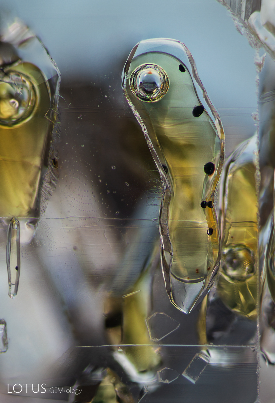 1. Secondary healed fissures in corundum are often filled with carbon dioxide, but usually in liquid form (solid carbon dioxide is what we know as “dry ice”). On occasion we see it in both liquid and gaseous form. This series of four images shows liquid carbon dioxide with a gas bubble (the yellow area). As the heat of the microscope warms the specimen, the gas bubble shrinks and eventually disappears. The critical temperature at which the phase changes is 31.2°C. The existence of carbon dioxide inclusions in sapphire was first noted by David Brewster in 1826. He also noted the explosive nature of such inclusions, which burst at temperatures generally between 250–400°C.