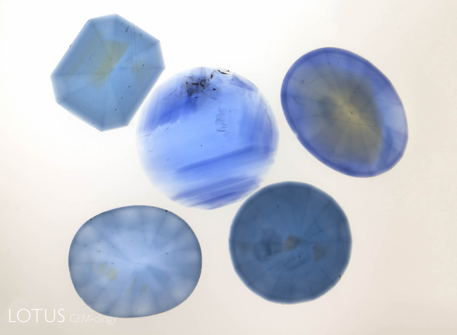 3. Five sapphires viewed in immersion against a diffuse white background. The center stone is natural, while the four stones surrounding it are Ti-diffused; note the dark girdles and facet junctions of the Ti-diffused stones.